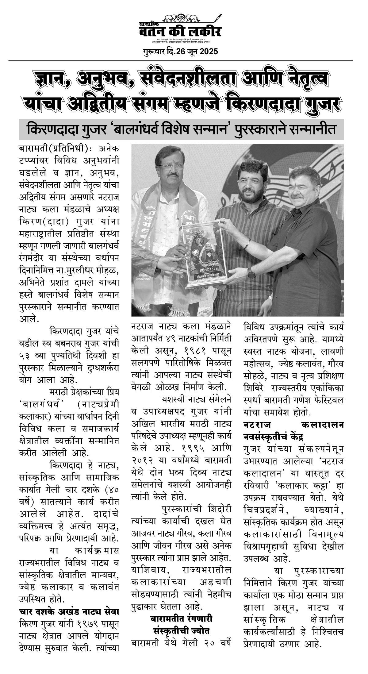 बारामती(प्रतिनिधी):अनेक टप्प्यांवर विविध अनुभवांनी घडलेले व ज्ञान, अनुभव, संवेदनशीलता आणि नेतृत्व यांचा अद्वितीय संगम असणारे नटराज नाट्य कला मंडळाचे अध्यक्ष किरण(दादा) गुजर यांना महाराष्ट्रातील प्रतिष्ठीत संस्था म्हणून गणली जाणारी बालगंधर्व रंगमंदीर या संस्थेच्या वर्धापन दिनानिमित्त ना.मुरलीधर मोहळ, अभिनेते प्रशांत दामले यांच्या हस्ते बालगंधर्व विशेष सन्मान पुरस्काराने सन्मानीत करण्यात आले.